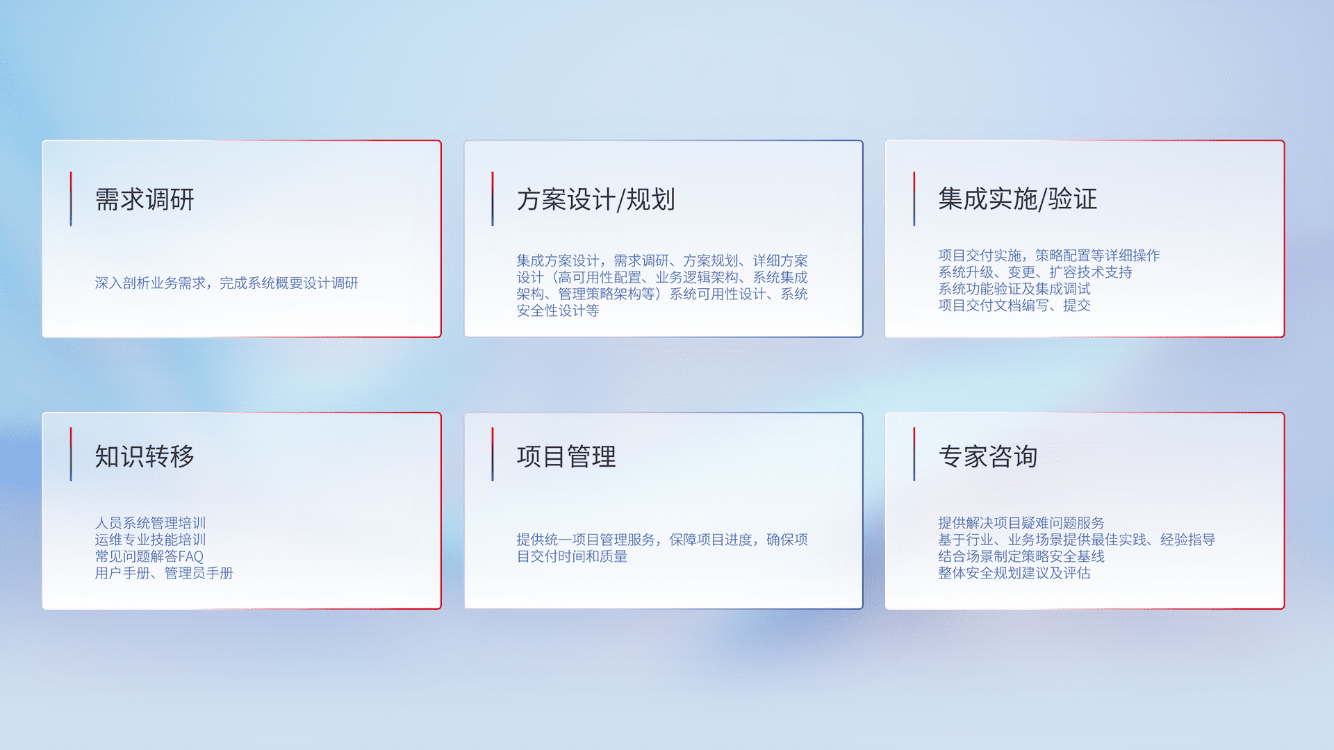针对客户行业特性,,,,将宏观的安全战略和需求,,通过专业的交付服务,,,实现项目落地,,,,为客户提供标准规范的集成交付服务。。。
